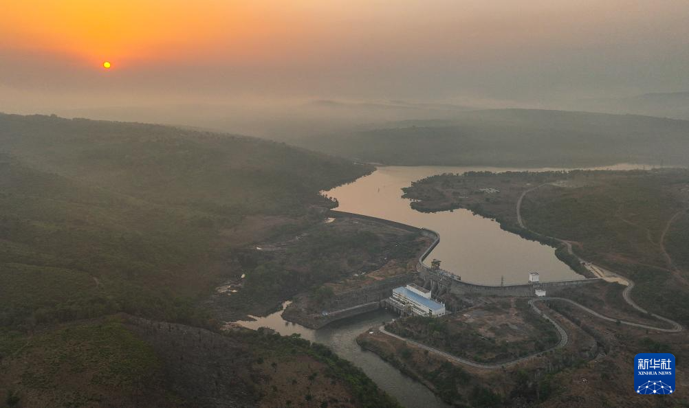 这是4月25日日出时分在几内亚杜布雷卡省拍摄的凯乐塔水电站(无人机照片)。