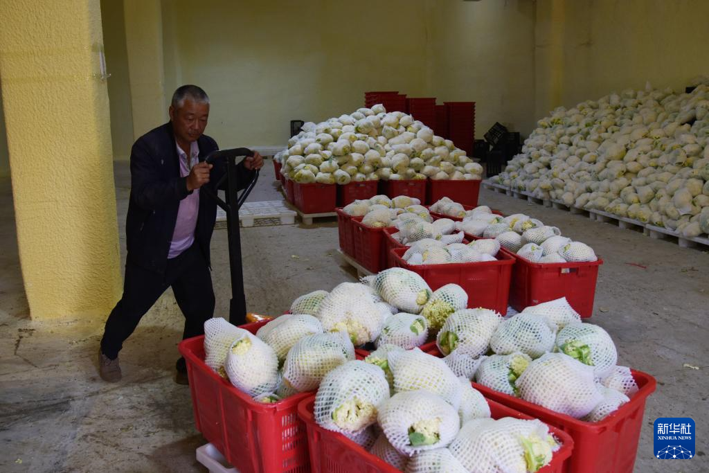 8月12日,在榆中县马坡乡上庄村高原夏菜交易中心,村民在冷库中转运散花菜。