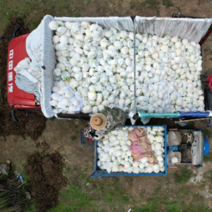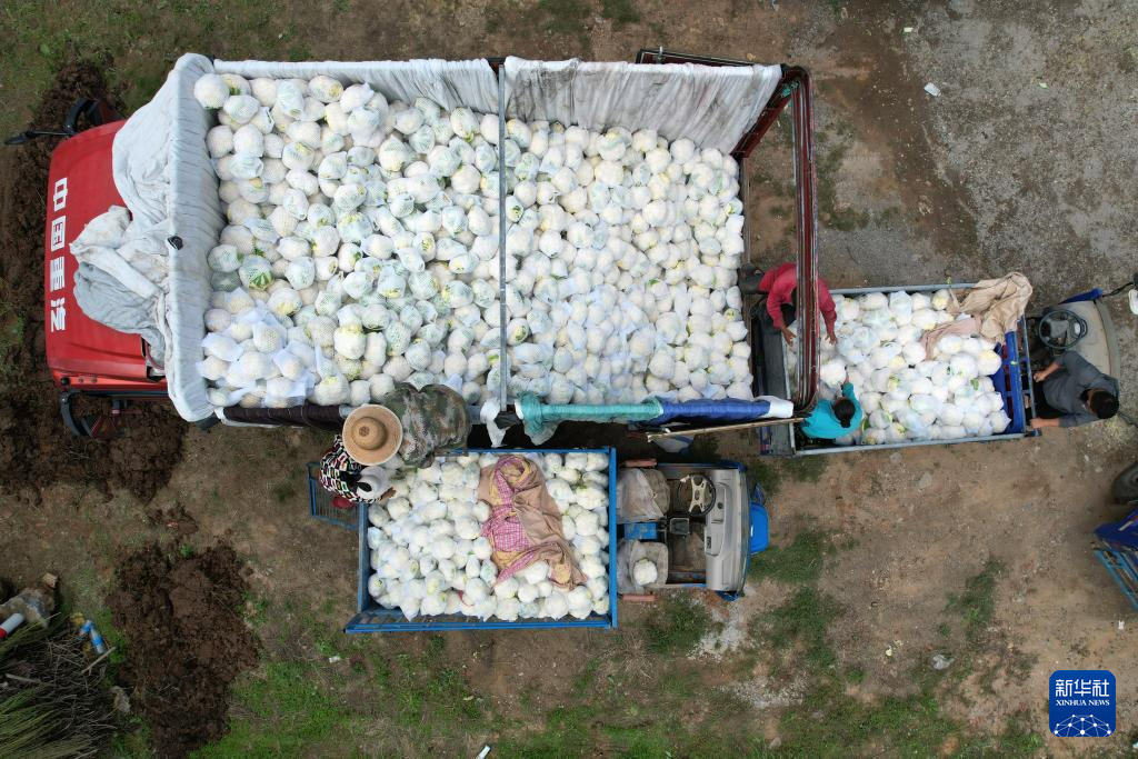 8月12日,在榆中县马坡乡上庄村,蔬菜收购商将从村民手中收购的散花菜装车(无人机照片)。