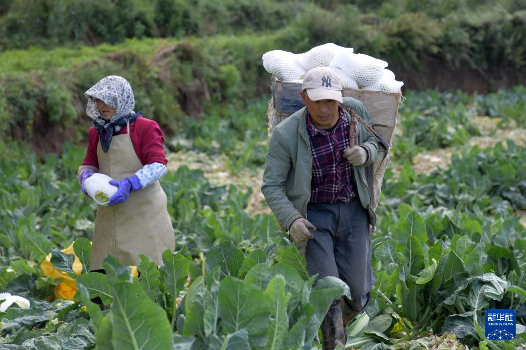 8月12日,在榆中县马坡乡上庄村,村民使用背篼将采摘的散花菜背出菜地。