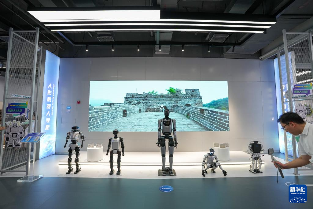 在位于北京经开区机器人大世界的全球首个具身智能机器人4S店(ROBOT MALL)内,观众参观展出和可供出售的人形机器人(8月6日摄)。