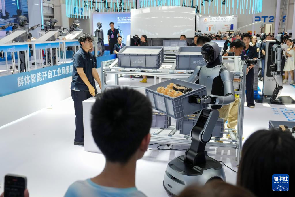 在世界机器人大会展馆内,观众在优必选公司展台观看人形机器人从入库搬运到智能分拣的全流程作业展示(8月11日摄)。