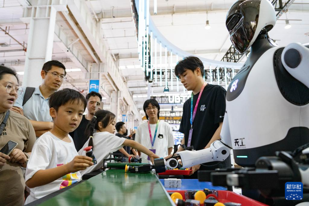 在世界机器人大会展馆内,观众与天工机器人进行零件分拣互动(8月8日摄)。