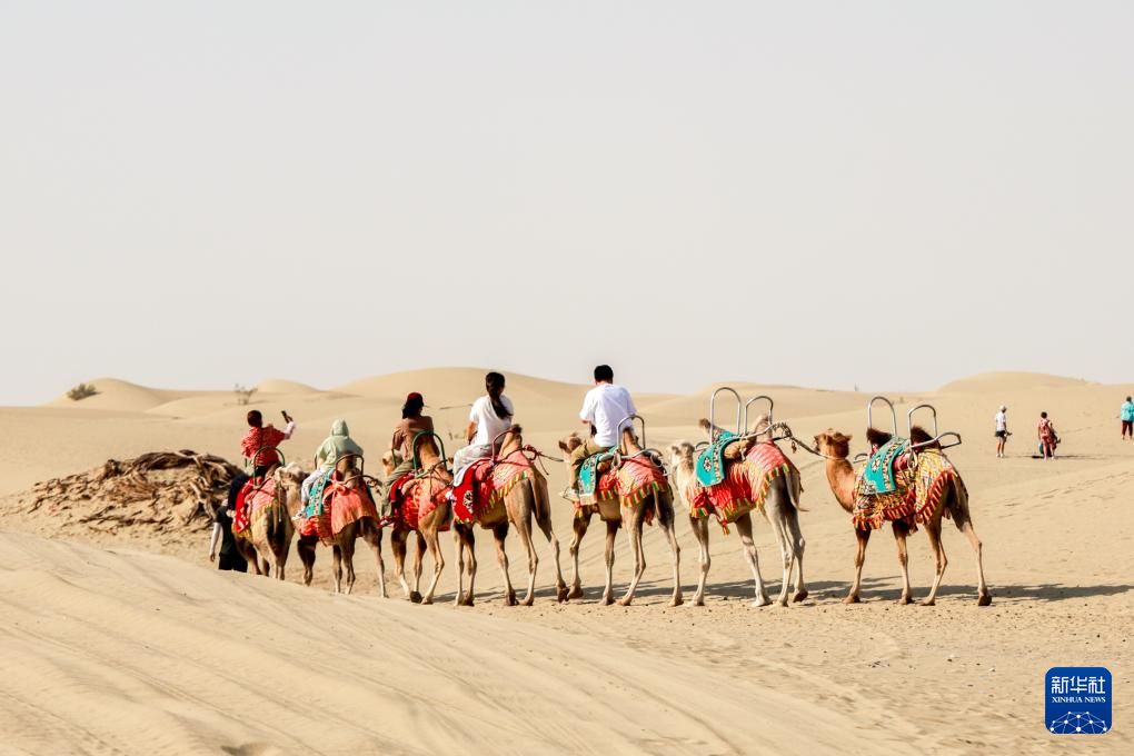 8月12日,在“沙漠之门”景区,游客骑骆驼游览塔克拉玛干沙漠。