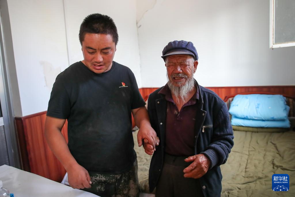 8月11日,在榆中县马坡乡上庄村临时安置点,村党支部书记陈万凯探望洪水中救出的最后一户人家的老人。