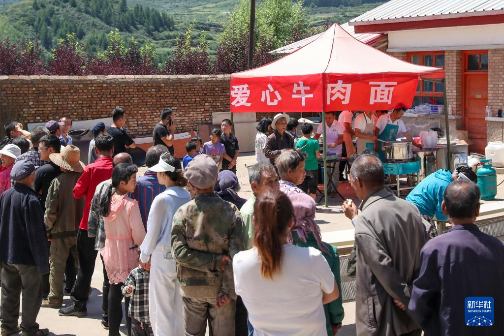 8月11日,在榆中县马坡乡上庄村临时安置点,受灾群众排队领取爱心牛肉面。