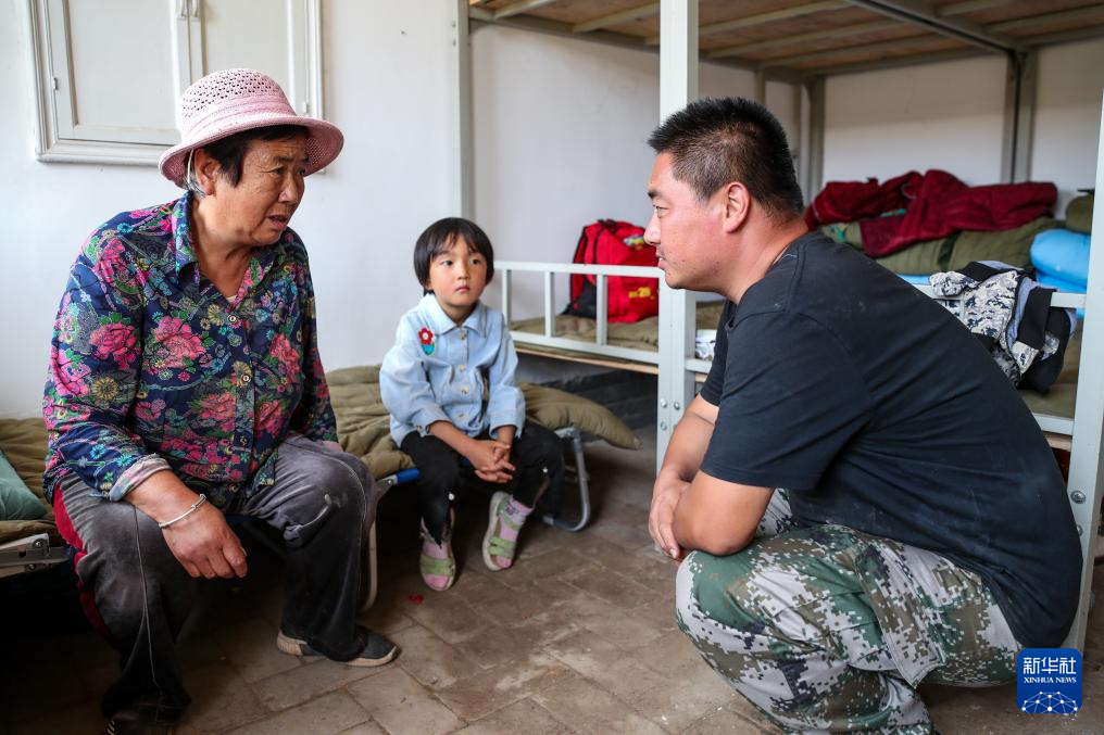 8月10日,在榆中县马坡乡上庄村临时安置点,村党支部书记陈万凯(右)和马莲滩村受灾群众交流。