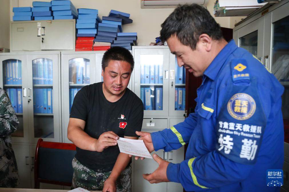 8月10日,在榆中县马坡乡上庄村民委员会,村党支部书记陈万凯将借两台发电机的借条递给救援队员。