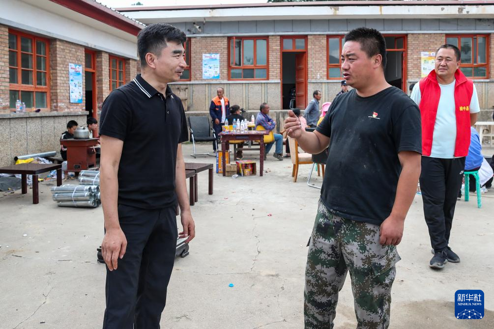 8月10日,在榆中县马坡乡上庄村临时安置点,村党支部书记陈万凯(前右)和刚刚抵达安置点的一家爱心牛肉面企业负责人交流。他告诉对方,在他们来之前,受灾群众已经吃了六顿方便面。