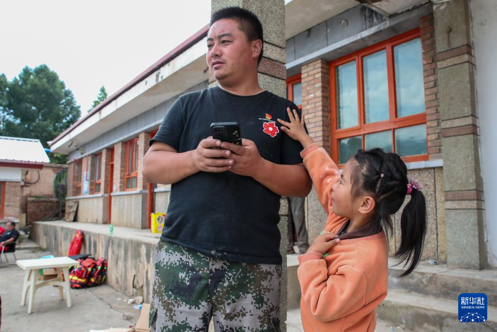 8月10日,在榆中县马坡乡上庄村临时安置点,一个小女孩将一朵小红花贴在陈万凯胸前。