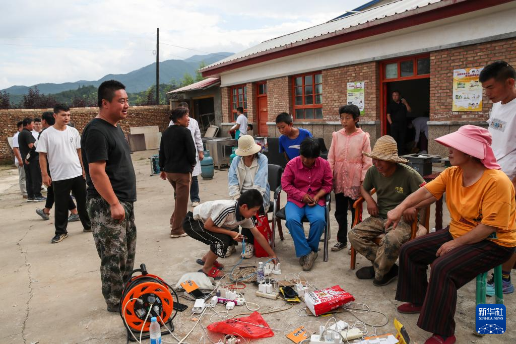 8月10日,在榆中县马坡乡上庄村临时安置点,村党支部书记陈万凯提醒受灾群众,给手机充电时注意安全。
