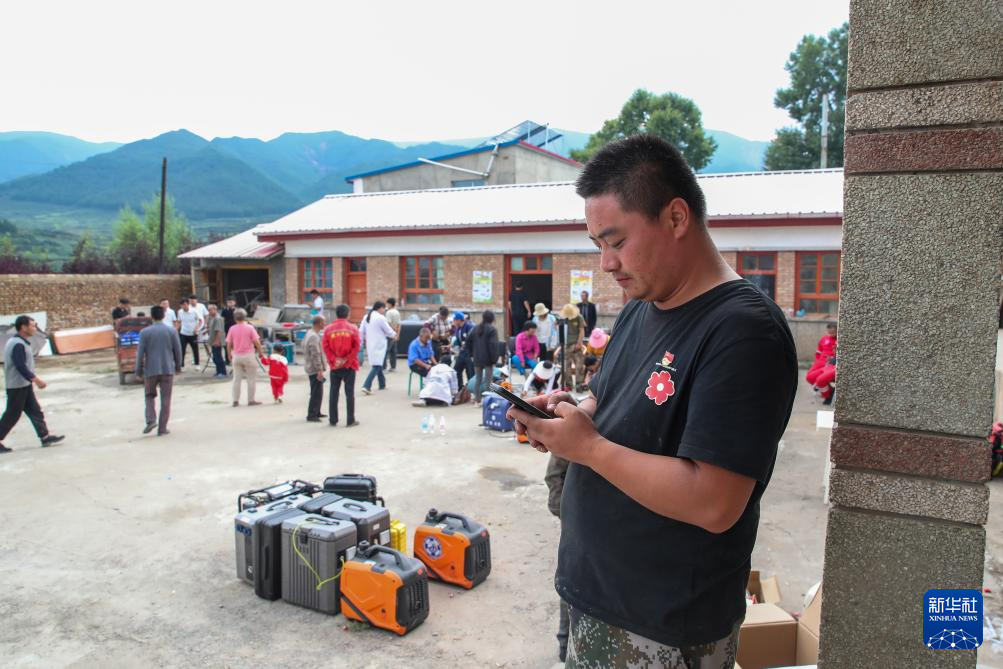 8月10日,在榆中县马坡乡上庄村临时安置点,村党支部书记陈万凯查看手机信息。