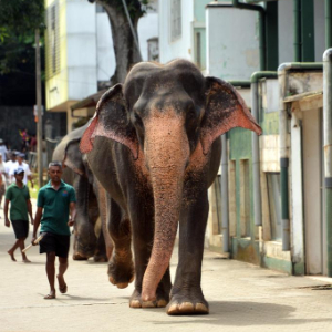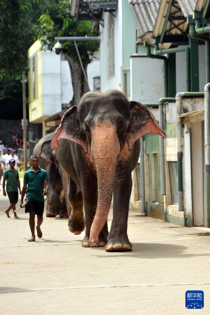 8月10日,大象在驯象师的引导下在斯里兰卡平纳维拉大象孤儿院附近散步。