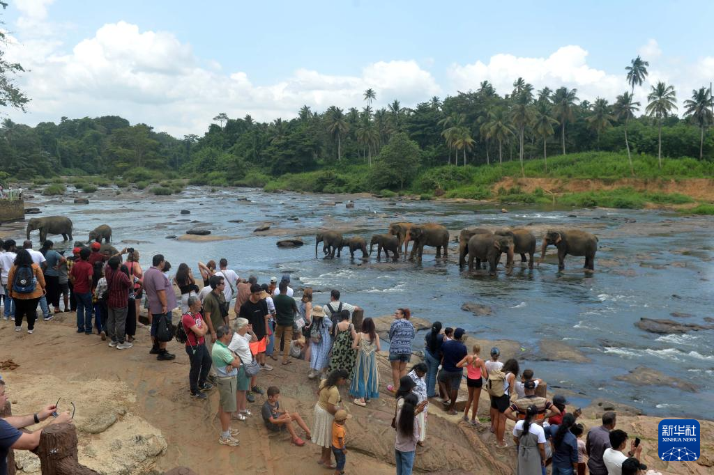 8月10日,游客在斯里兰卡平纳维拉大象孤儿院观看象群。