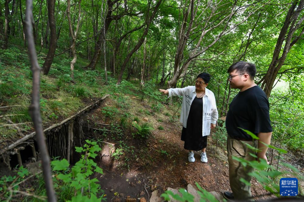 8月11日,在位于吉林磐石的红石砬子抗日根据地遗址,磐石市抗日斗争纪念馆馆长李秋虹(左)向马铖明介绍抗联历史。