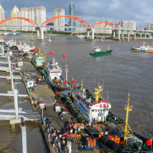 近日,东海部分海域结束为期3个月的伏季休渔期,浙江舟山市申请了专项捕捞特许的渔船结束休渔,开赴东海海域进行捕捞作业。渔运船和渔船一同抵达作业渔场,捕捞上来的海产品由渔运船先行送回港口码头,渔船则留在海上继续生产。