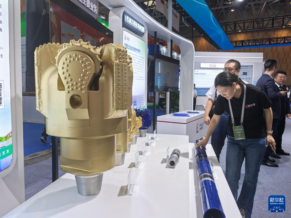 8月13日,观众在展览会上了解钻头钻杆装备。