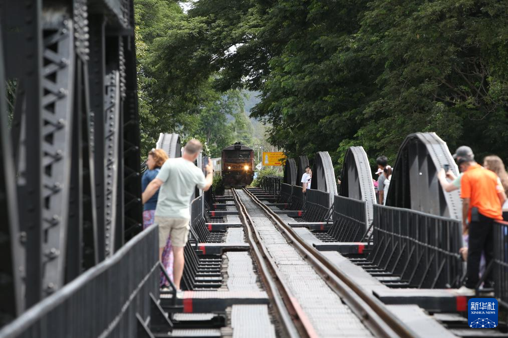 8月13日,游客在泰国北碧府桂河大桥上拍摄驶近的火车。