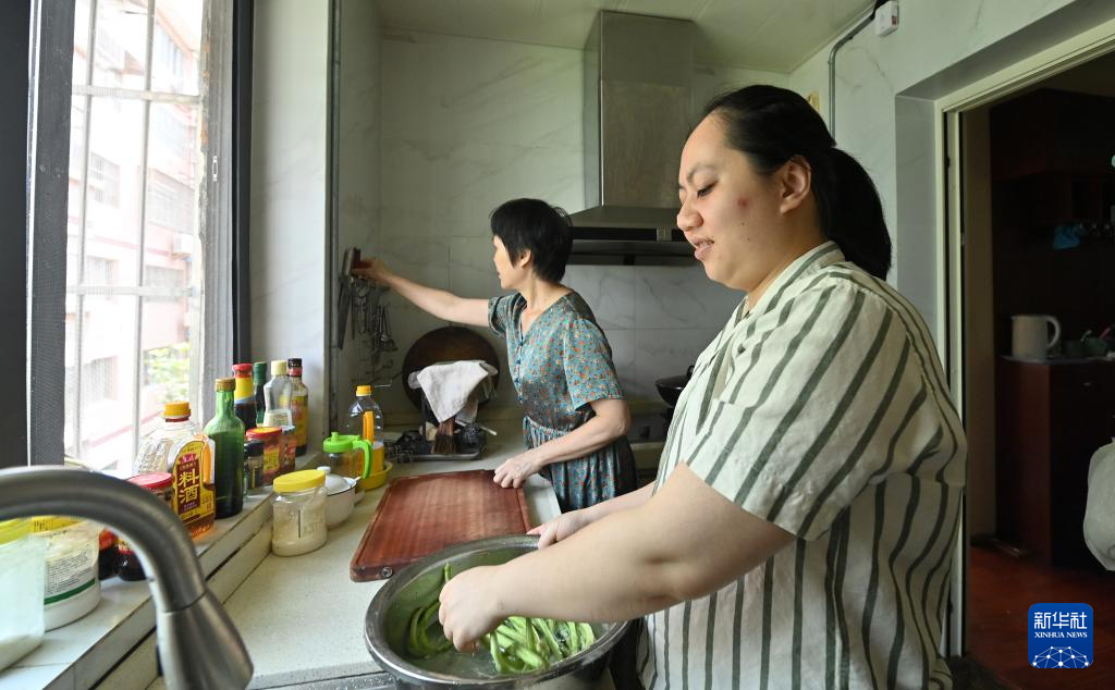 8月13日,李莹(前)在广西南宁市的家中洗菜准备做饭。