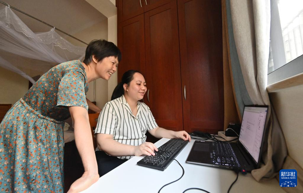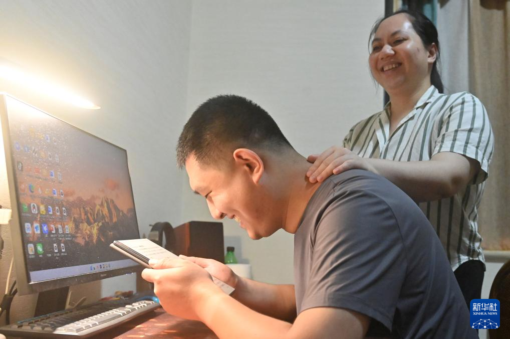 8月13日,李莹(右)陪伴爱人邵学明在广西南宁市的家中学习。