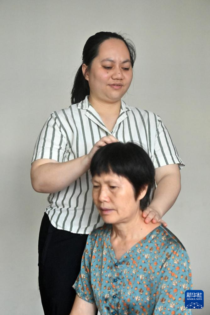 8月13日,李莹(后)在广西南宁市的家中给妈妈按摩。