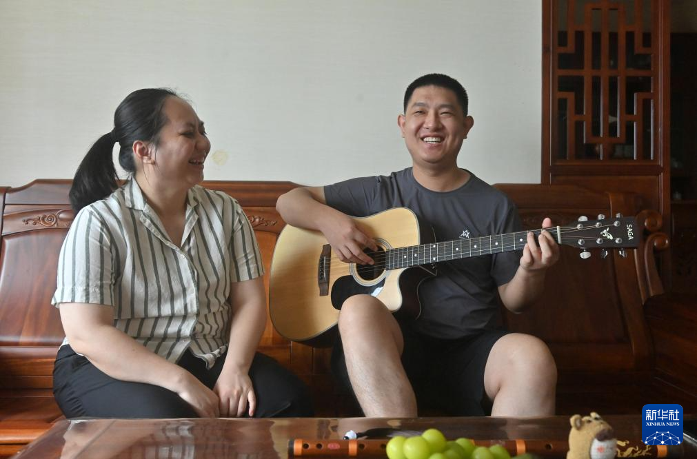 8月13日,在广西南宁市的家中,李莹(左)听爱人邵学明弹唱乐曲。邵学明是一名低视力视障人士。