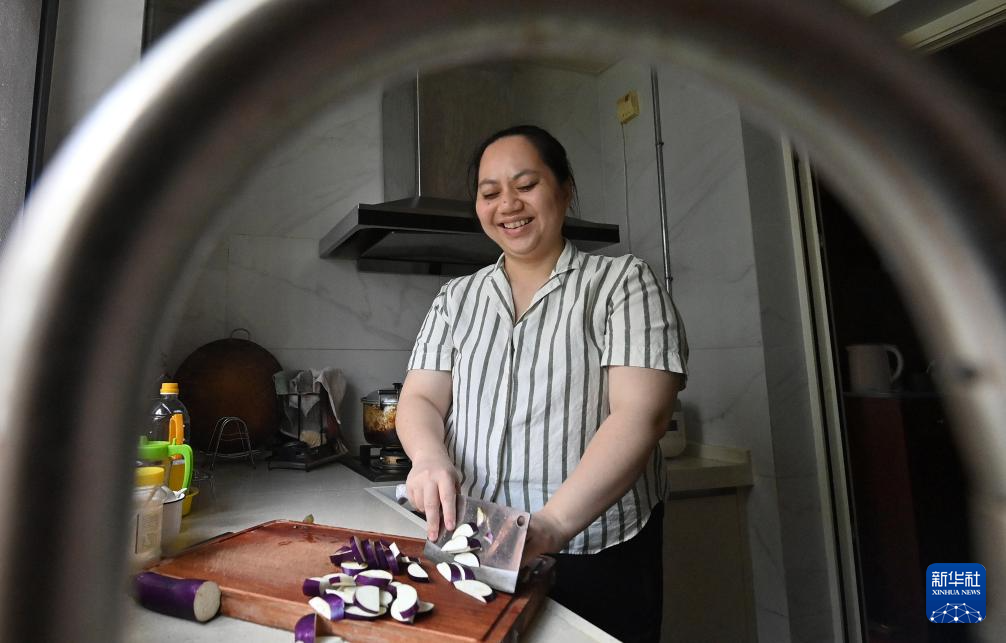 8月13日,李莹在广西南宁市的家中切菜准备做饭。