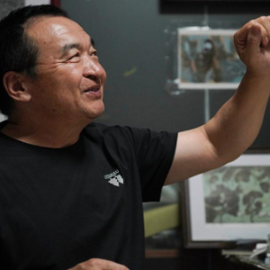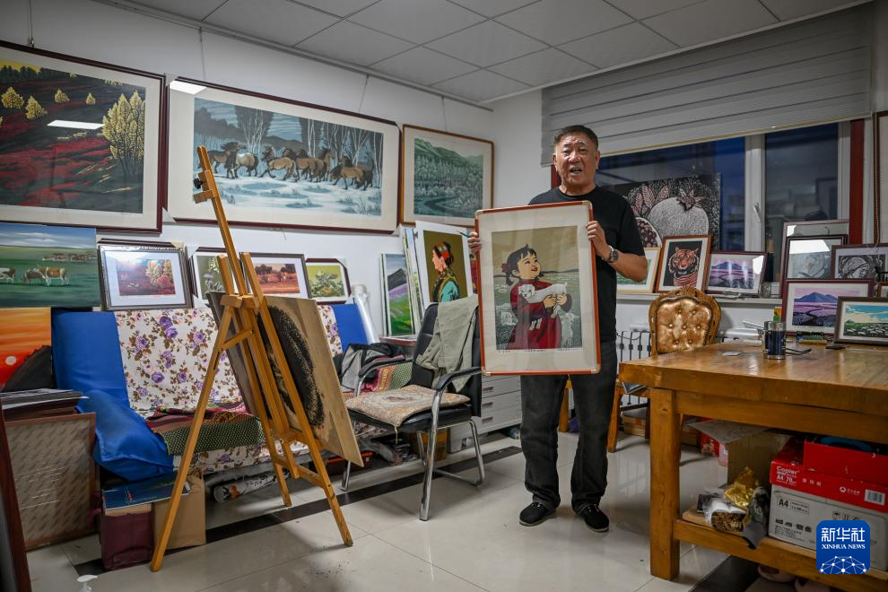 8月10日,在内蒙古扎鲁特旗版画院,扎鲁特版画代表性传承人照那木拉展示自己的作品。