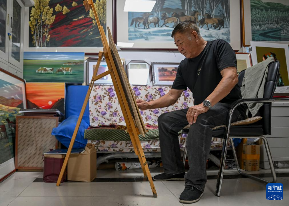 8月10日,在内蒙古扎鲁特旗版画院,扎鲁特版画代表性传承人照那木拉在画室创作。