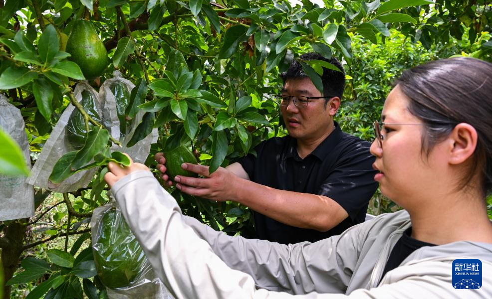 在海南省白沙黎族自治县荣邦乡一牛油果种植园,中国热科院品资所果树中心研究员王甲水(左)与同事查看牛油果生长情况(8月13日摄)。