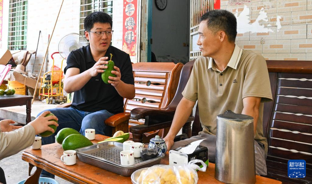 在海南省白沙黎族自治县荣邦乡一牛油果种植园附近,中国热科院品资所果树中心研究员王甲水(左)与种植户陈传军进行交流(8月13日摄)。