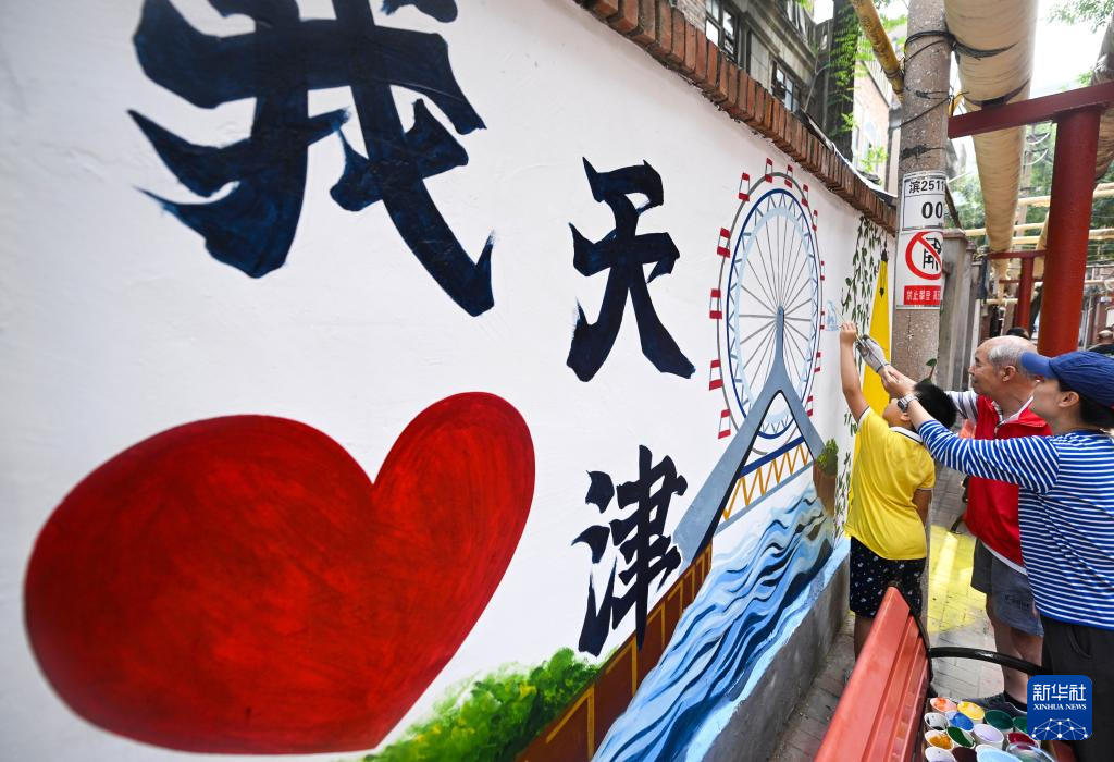 8月15日,在天津市和平区劝业场街道兆丰路社区,志愿者和社区居民对一处胡同的老旧墙体进行彩绘美化。