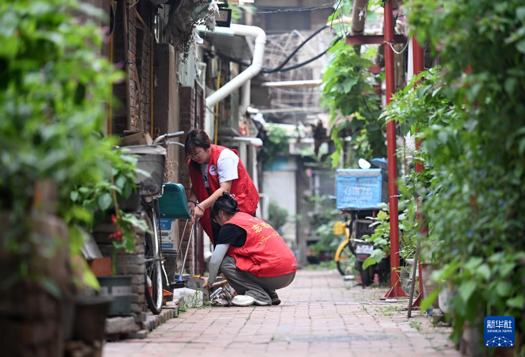 8月15日,在天津市和平区劝业场街道兆丰路社区,社区工作人员和志愿者清理胡同的卫生死角。