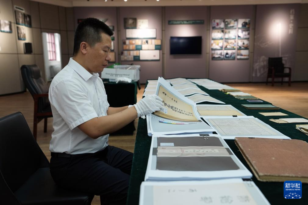 哈尔滨市侵华日军细菌与毒气战史研究会副秘书长金士成在侵华日军第七三一部队罪证陈列馆整理新罪证新史料(8月13日摄)。