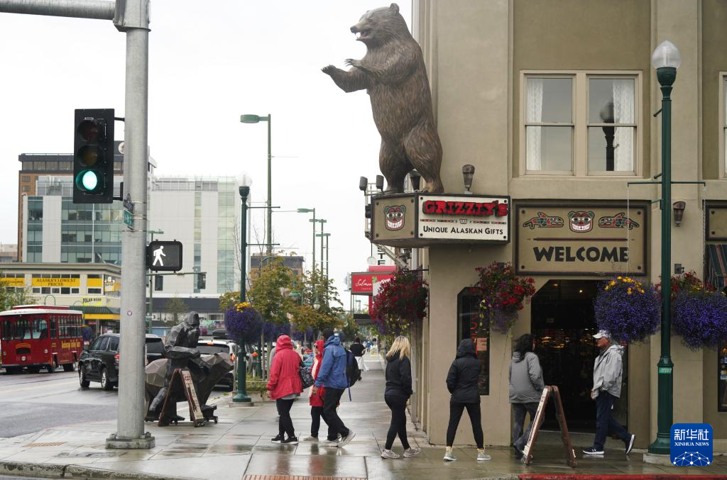 8月14日,行人从美国阿拉斯加州安克雷奇市中心街头走过。