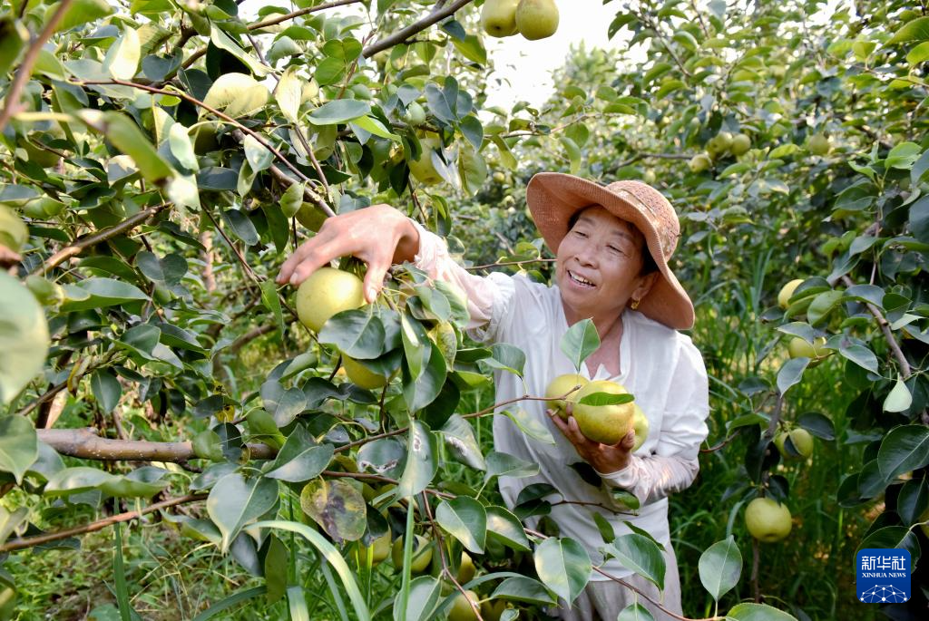 8月14日,果农在河北威县龙集梨园内采摘梨果。