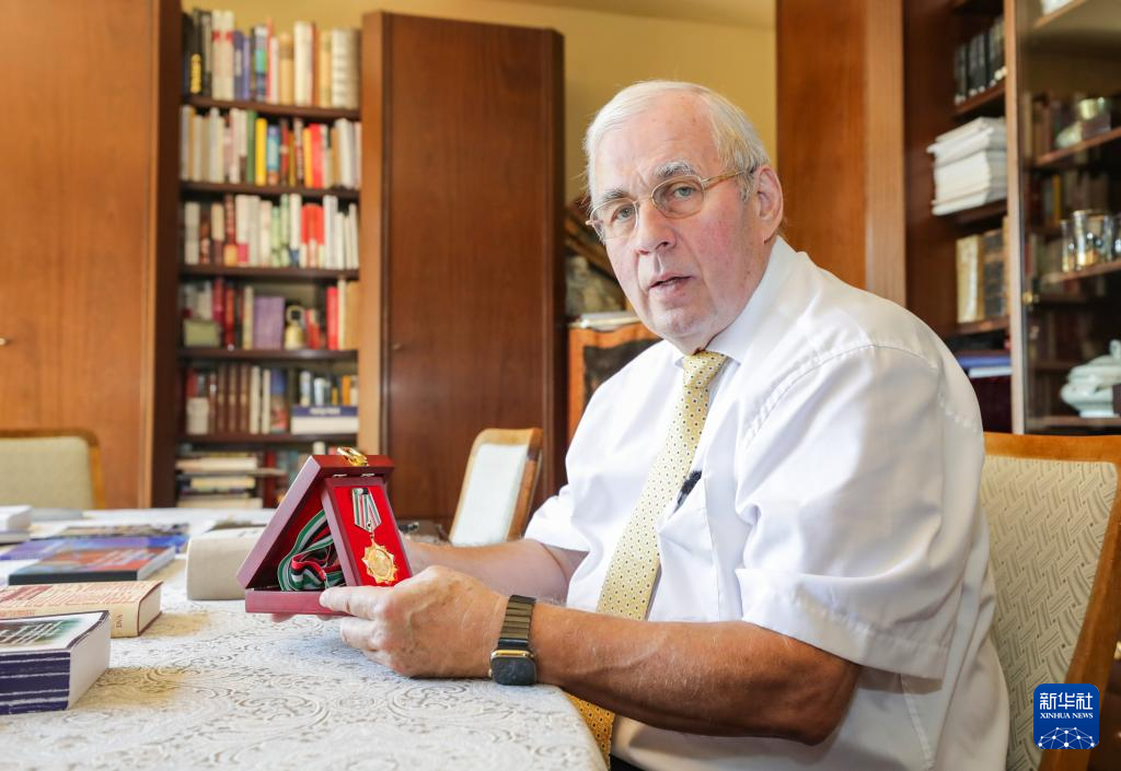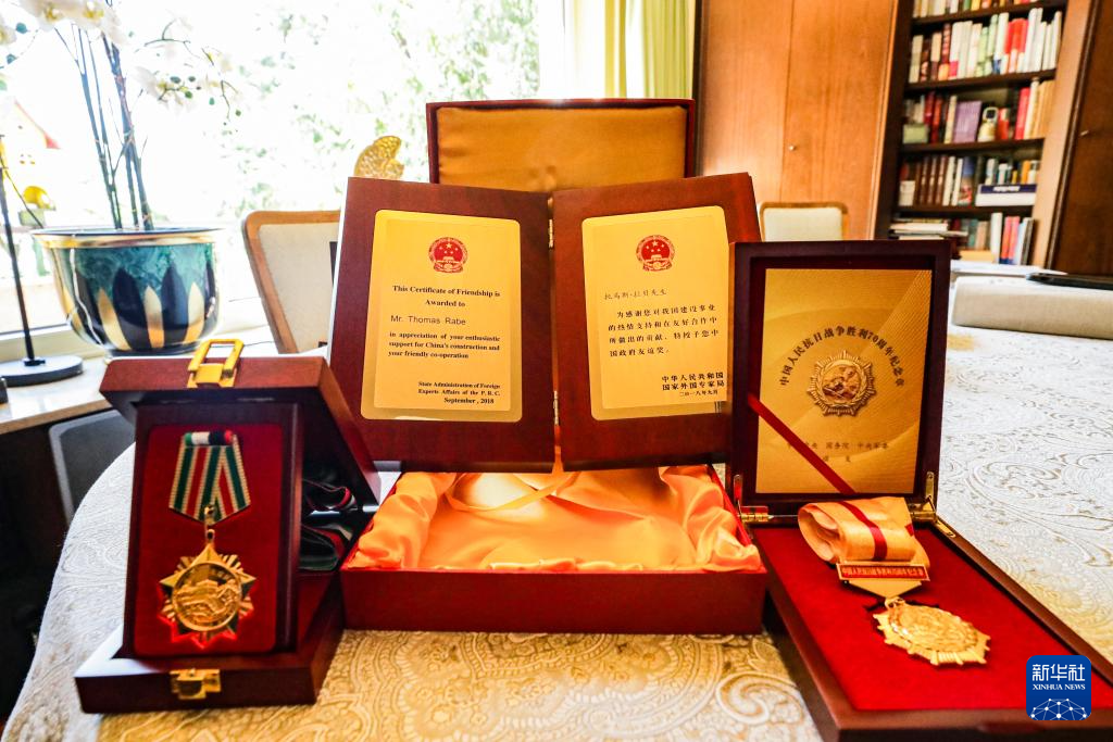 8月7日,托马斯·拉贝在德国海德堡约翰·拉贝交流中心内展示自己佩戴中国政府友谊奖奖章的照片。托马斯·拉贝在2018年荣获中国政府友谊奖,这是中国政府专门为表彰对中国改革发展作出重要贡献的来华工作外国专家设立的荣誉奖项。