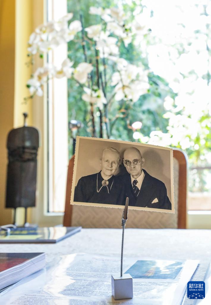 这张8月7日拍摄的照片展示的是德国海德堡约翰·拉贝交流中心内拍摄于1947年的约翰·拉贝与夫人多拉·拉贝合影。