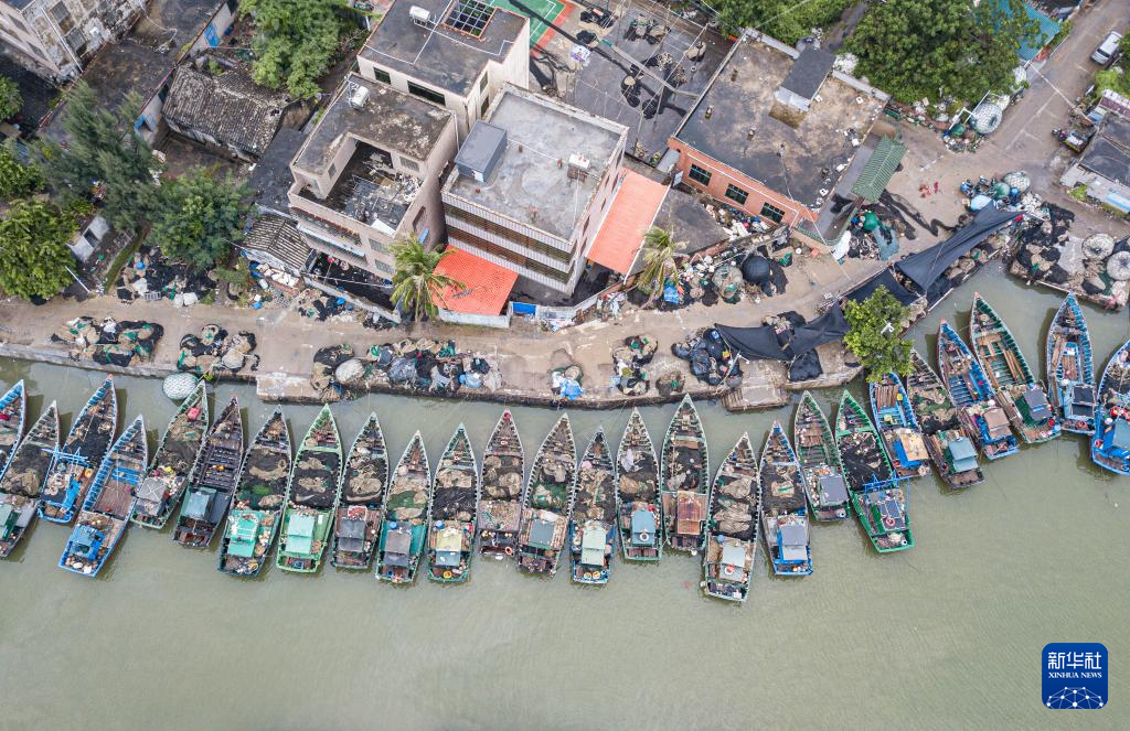 8月16日,大批渔船在海口三联渔港避风,暂缓出海(无人机照片)。