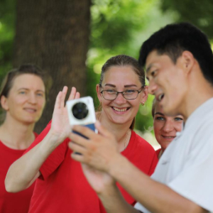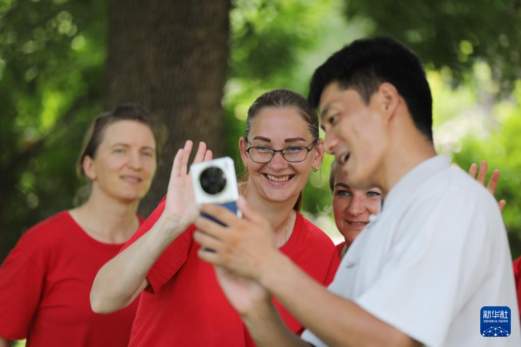 8月16日,在河南省焦作市温县陈家沟,太极拳师郑赢全和拉脱维亚学员分享交流。