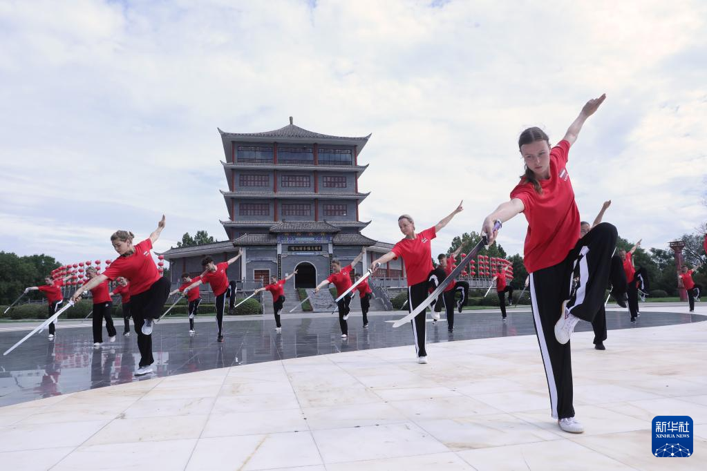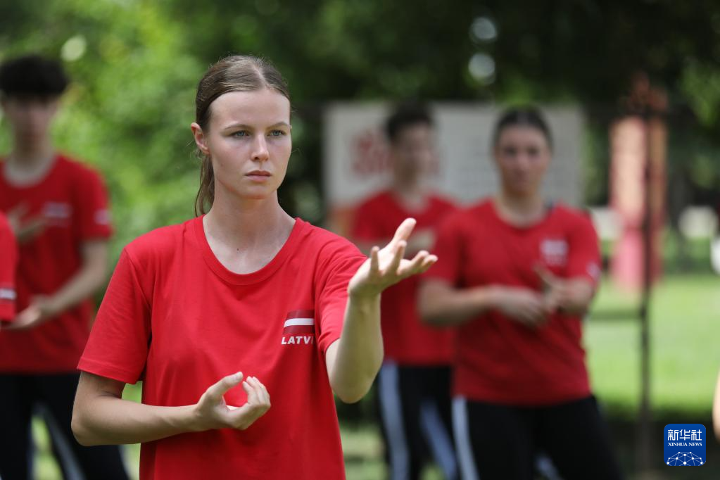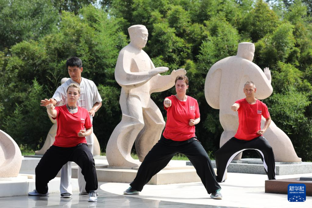8月16日,在河南省焦作市温县陈家沟,拉脱维亚学员在练习太极拳。