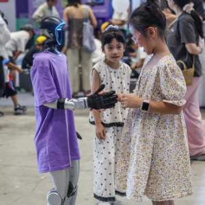 8月17日,在青少年科技嘉年华上,宇树科技机器人跟孩子们互动。