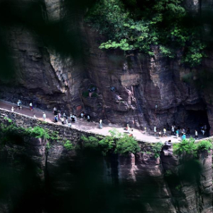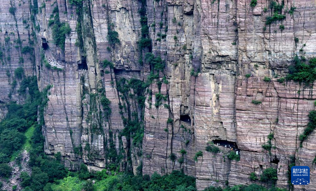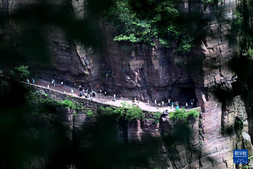 8月16日,游客在河南万仙山景区郭亮村“绝壁长廊”上游玩。