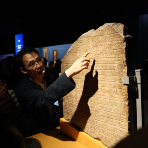 8月17日,讲解员(右)在向观众介绍石碑上的古埃及文字。