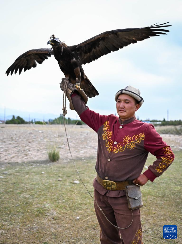 8月16日,在吉尔吉斯斯坦乔尔蓬阿塔附近,小猎人扎帕尔表演狩猎。