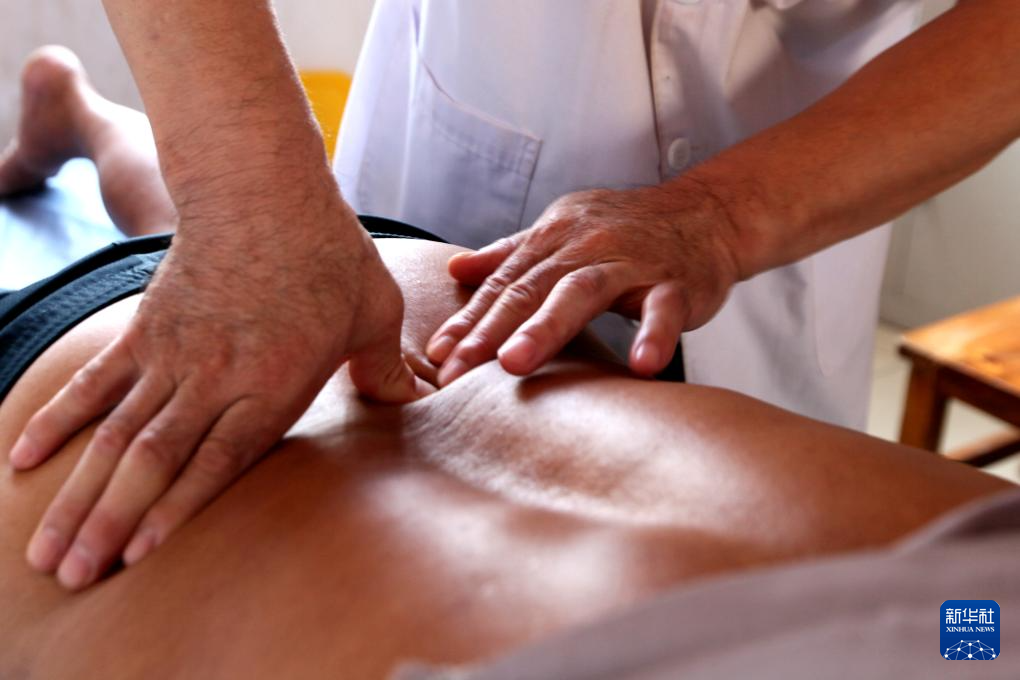 8月18日,在山东省临沂市平邑县温水镇卫生院,中医师为患者正骨推拿。