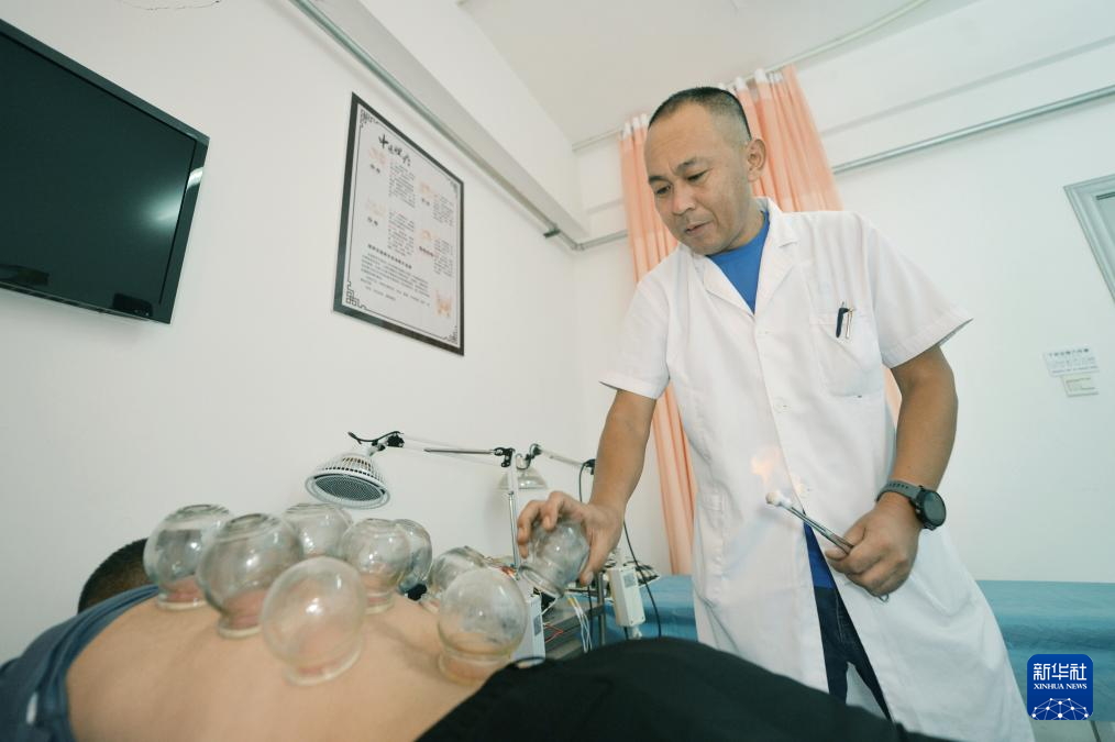 8月18日,在山东省青岛市城阳区红岛街道社区卫生服务中心,医生在为社区居民拔火罐。