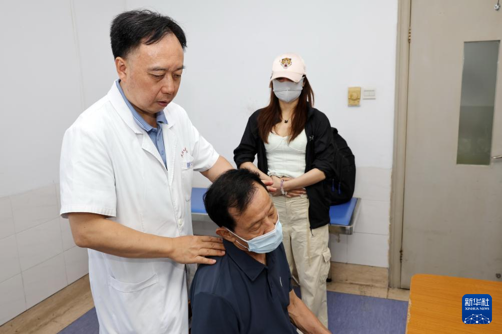 8月18日,在湖北武汉,武汉大学中南医院骨科康复科的主任医师为患者进行治疗。