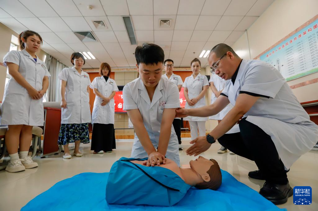 8月18日,河北省遵化市人民医院的医生在练习心肺复苏急救技巧。
