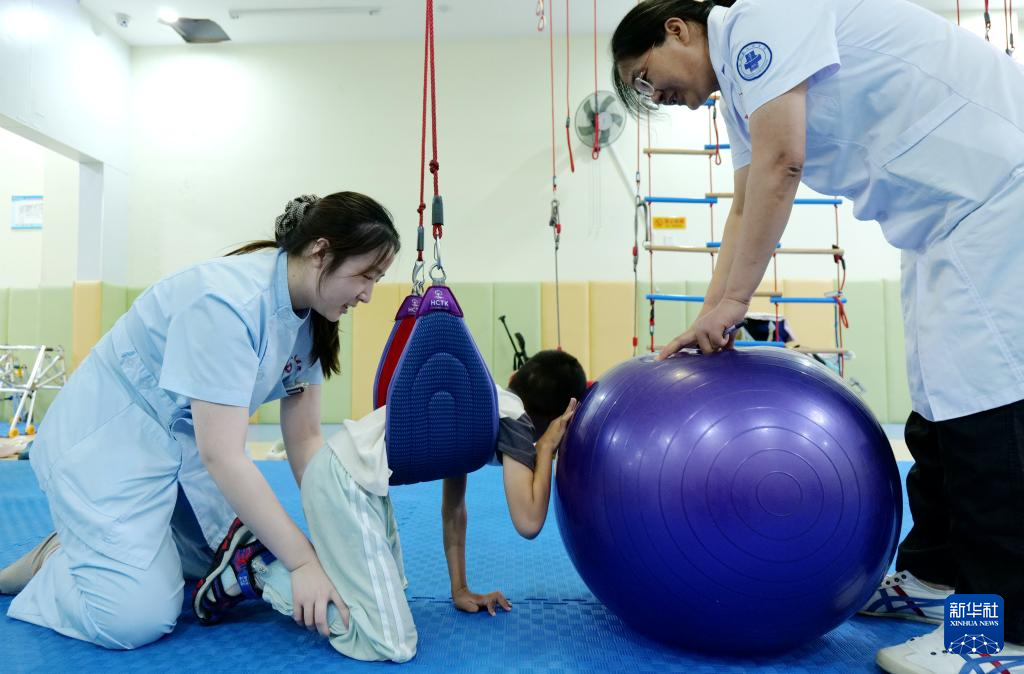 8月18日,在山东省滨州市惠民县人民医院儿童康复科,医生为一名脑瘫患儿进行康复训练
